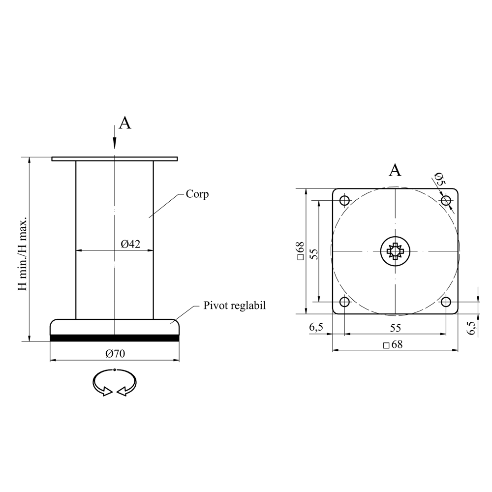 Picior reglabil A6, 710mm, GTV, Crom