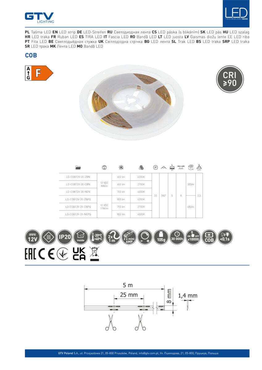 Benzile LED ne-au însoțit timp de mulți ani, găsind o gamă foarte largă de aplicații în case, birouri și magazine. Spre deosebire de benzile tradiționale bazate pe diode SMD, unde punctele luminoase sunt vizibile, benzile din tehnologia COB creează o linie uniformă de lumină, fără puncte vizibile. Acest efect se datorează diodelor dispuse foarte dens, care sunt de până la 480° pe 1 metru de lungime a benzii. Unghiul este, de asemenea, mai mare – 180°. Banda noastră COB are un indice de redare a culorilor CRI foarte ridicat, RA>90.